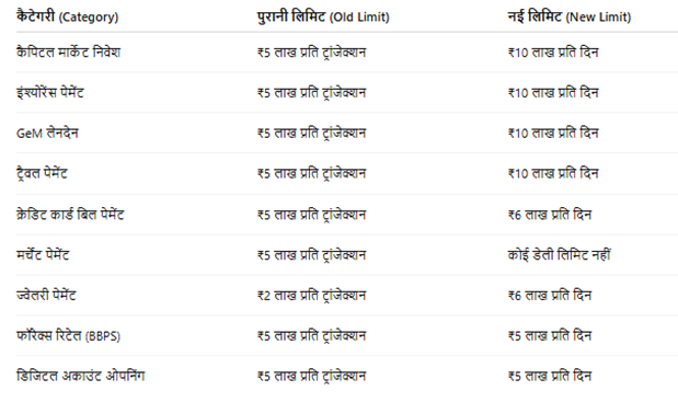 अब इंश्योरेंस, कैपिटल मार्केट, लोन ईएमआई और ट्रैवल जैसी कैटेगरी में प्रति ट्रांजैक्शन 5 लाख रुपये तक और एक दिन में अधिकतम 10 लाख रुपये तक का भुगतान किया जा सकेगा।
